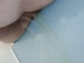 "Mother-in-law's gray-haired pussy pees while son-in-law jerks off nearby, bottom view"