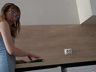 "Stunning busty bitch masturbates in the kitchen before her lover arrives"