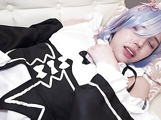 "Asian maid Miu Akino rubbed with dildo on her clit while moaning on the couch."