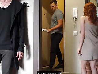"Young wife having sex with a pizza delivery guy while her husband watches"